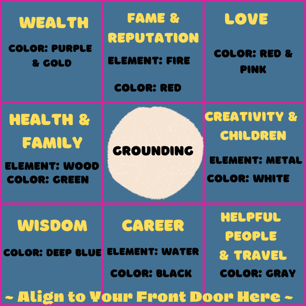 Some Feng Shui practitioners orient their grid to the cardinal directions – North, South, East and West. It is more traditional to align this stand-alone grid to the front door of your home or room. This older style comes from the Black Hat Sect of Tantric Buddhism and follows the principle that spirit is not rooted in the Earth so each unique space aligns as its own energy fractal. Thus apply the bagua map to the front door of each space – the front door of your house and then the main door to each room of your house.